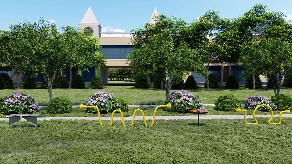 Музыкалык дубал перкуссия оюндары - бул "м" англис тамгасына окшоп калыптанган жана толугу менен сары түстө. Эки мүйүз ооздун эки башка багытта балдардын эркин ойношу керек.